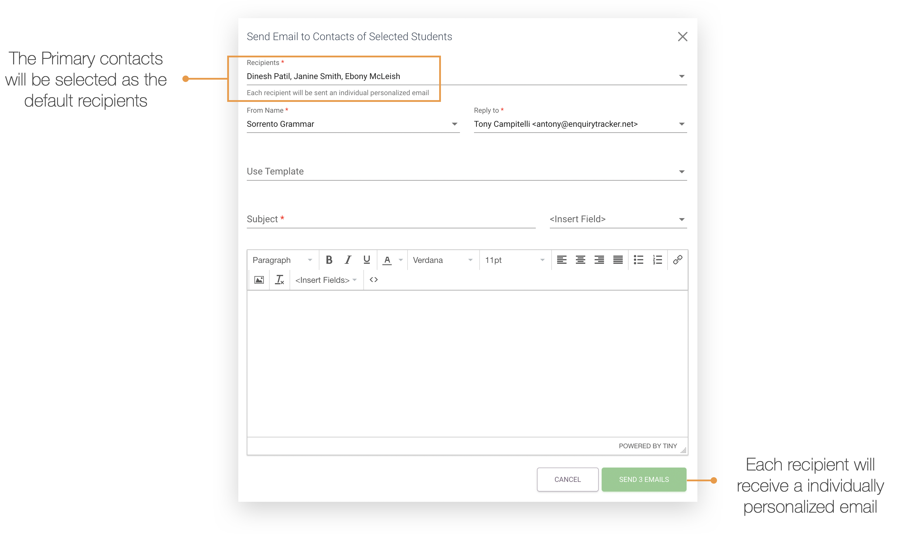 Note: A separate email will be sent to every recipient listed with a check mark in the recipients list.