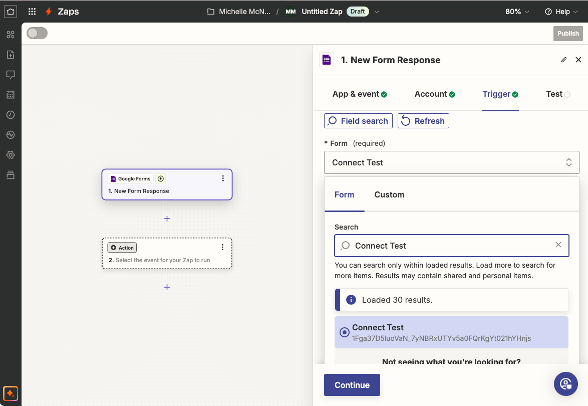 Select your Trigger. We'll move forward with an example by using Google Forms as a trigger