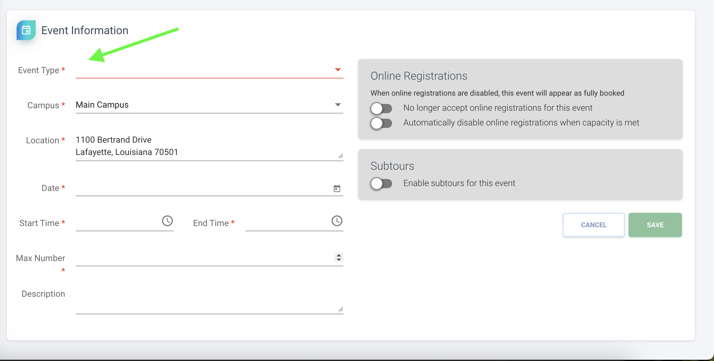 Here you can click on Add New to add a new event type. You can also click the pencil icon next to existing event types to edit them or the trash can icon to delete them.
